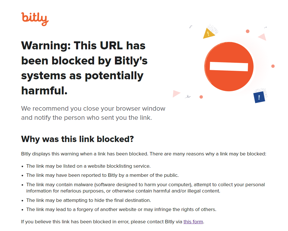 …で、次のようなWarningの表示がされてしまいました(Warning: This URL has been blocked by Bitly's systems as potentially harmful.)。